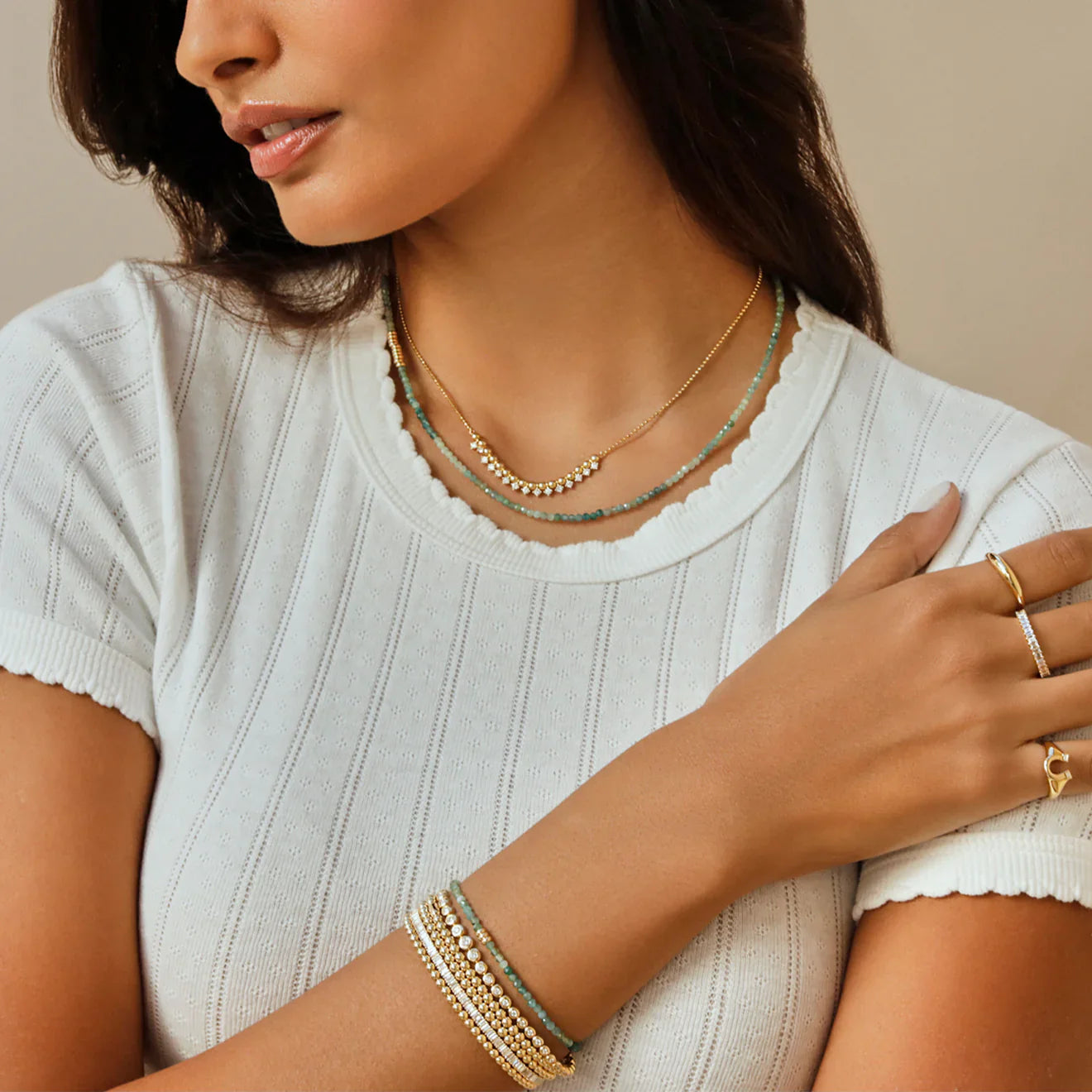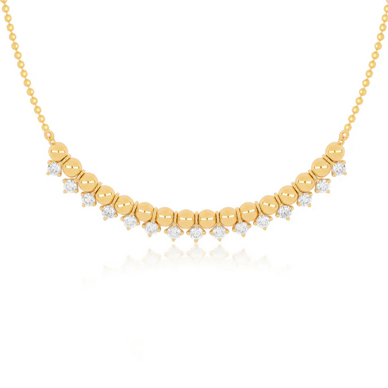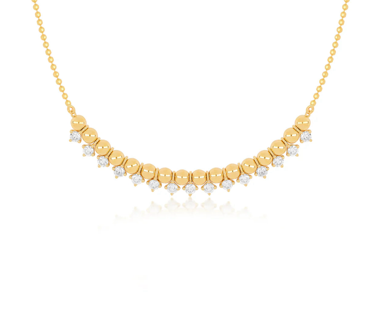 The Diamond & Gold Ball Necklace glistens with 16 gold balls and 15 diamonds resting in between each sphere. Designed to move with you, this necklace rounds out any layered look. Go ahead, have a ball.