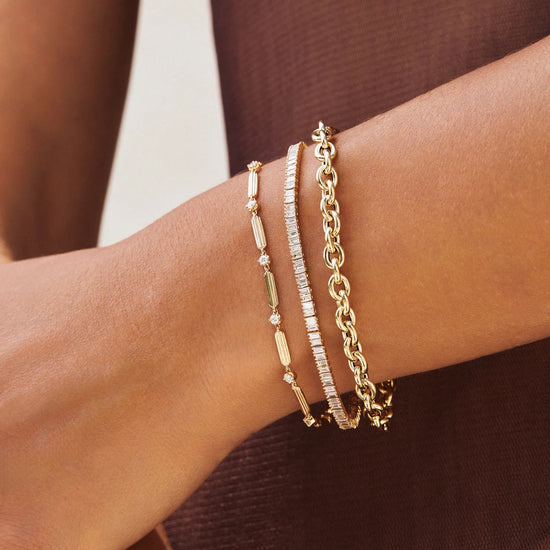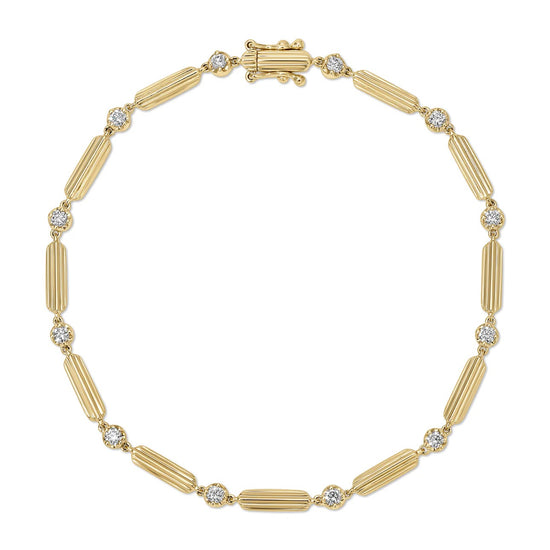 This eternity bracelet encircles the wrist in texture and sparkle, featuring fluted gold bars and diamonds in bold crown settings. Finished with a secure box clasp, it's designed to be a daily staple.