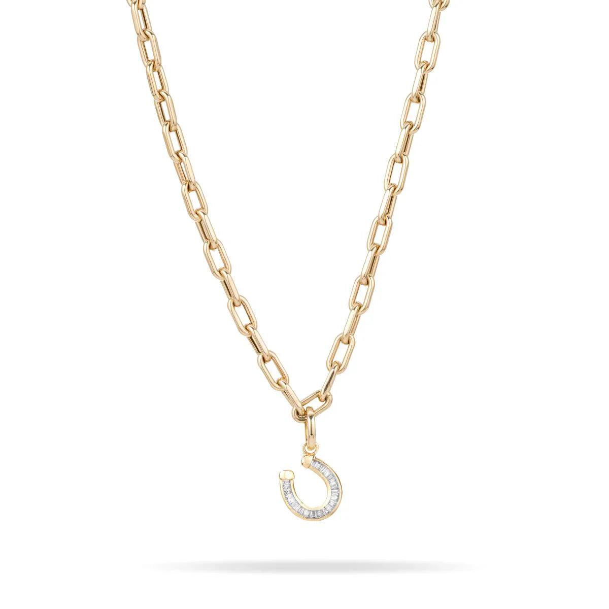 A symbol of luck, reimagined in signature Adina Reyter style. Handcrafted in 14k yellow gold and set with hand-placed genuine baguette diamonds, this bestselling charm brings a modern edge to a timeless motif. The horseshoe is long believed to attract good fortune and positive energy—worn to protect and inspire.