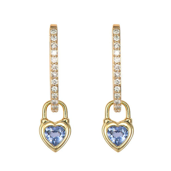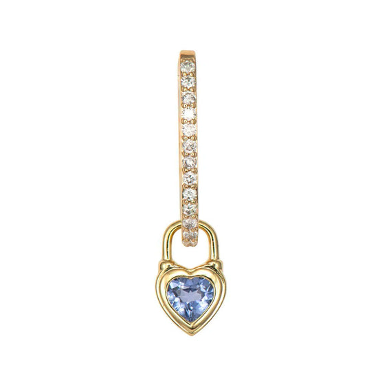 Vibrant heart shaped sapphire bezel set in 14K yellow gold make the Single Beating Heart Sapphire Charm sparkle. This tiny charm looks amazing on a Three Stories hoop earring or added to a detachable bale and hung on a Three Stories chain necklace or bracelet.