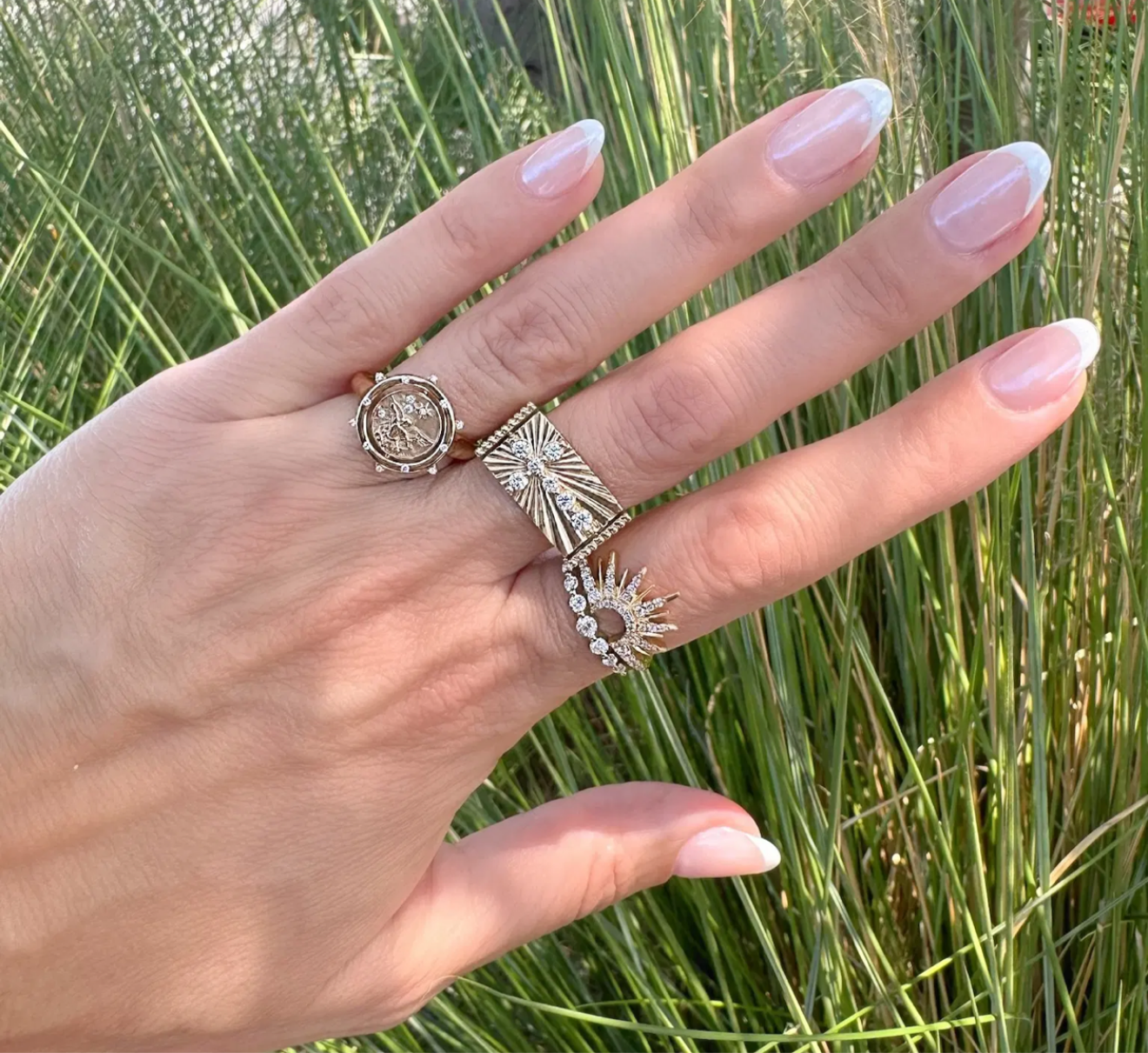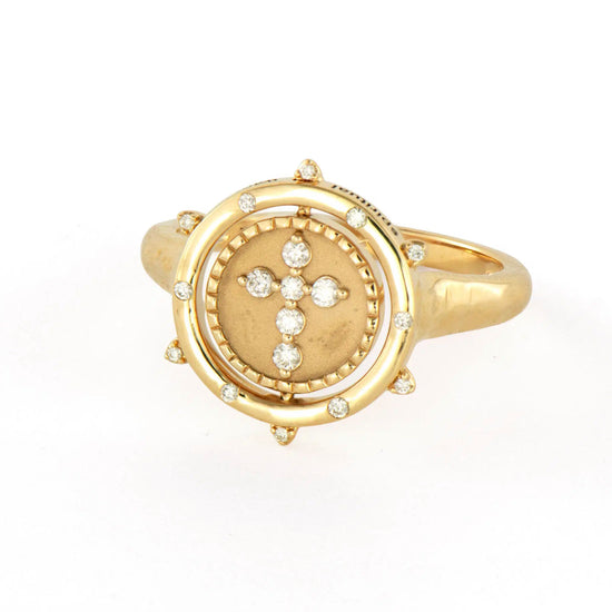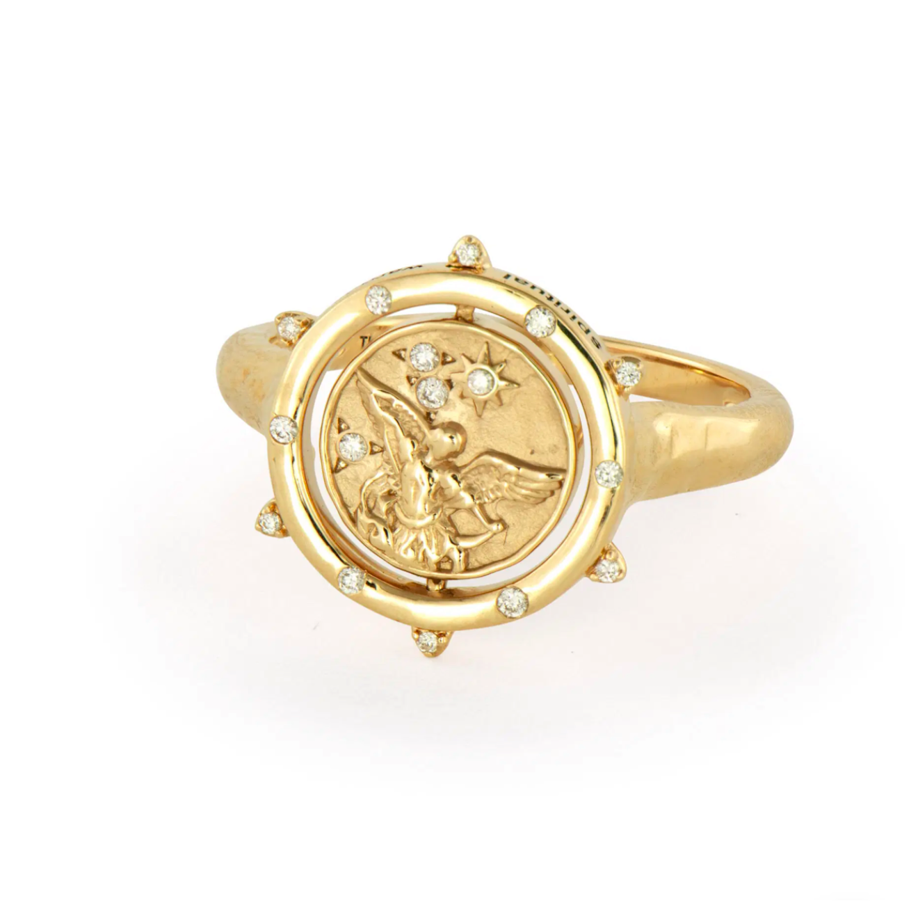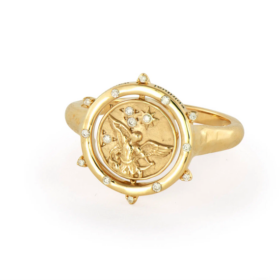 The Cross/Archangel Michael Double Sided Flip Ring combines faith and divine protection in one meaningful piece. Crafted in 14K gold, one side features a pavé diamond cross representing faith and devotion. Flip it over to reveal an intricately detailed Archangel Michael design, symbolizing divine protection and strength in the face of adversity.