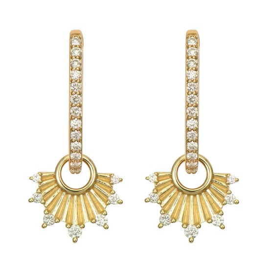 This Delicate Ruffled Fan Charm features an intricate fan design in 14K yellow gold, with exquisite ruffled details that create beautiful texture and dimension. The fan's surface sparkles with diamonds, adding a luxurious brilliance to its vintage-inspired silhouette. This dazzling charm can be worn on Three Stories hoop earrings or added to a chain bracelet or necklace by adding an openable pendant bale. Perfect for adding a touch of refined femininity and old-world elegance to your jewelry collection. Hoops and charms sold separately.