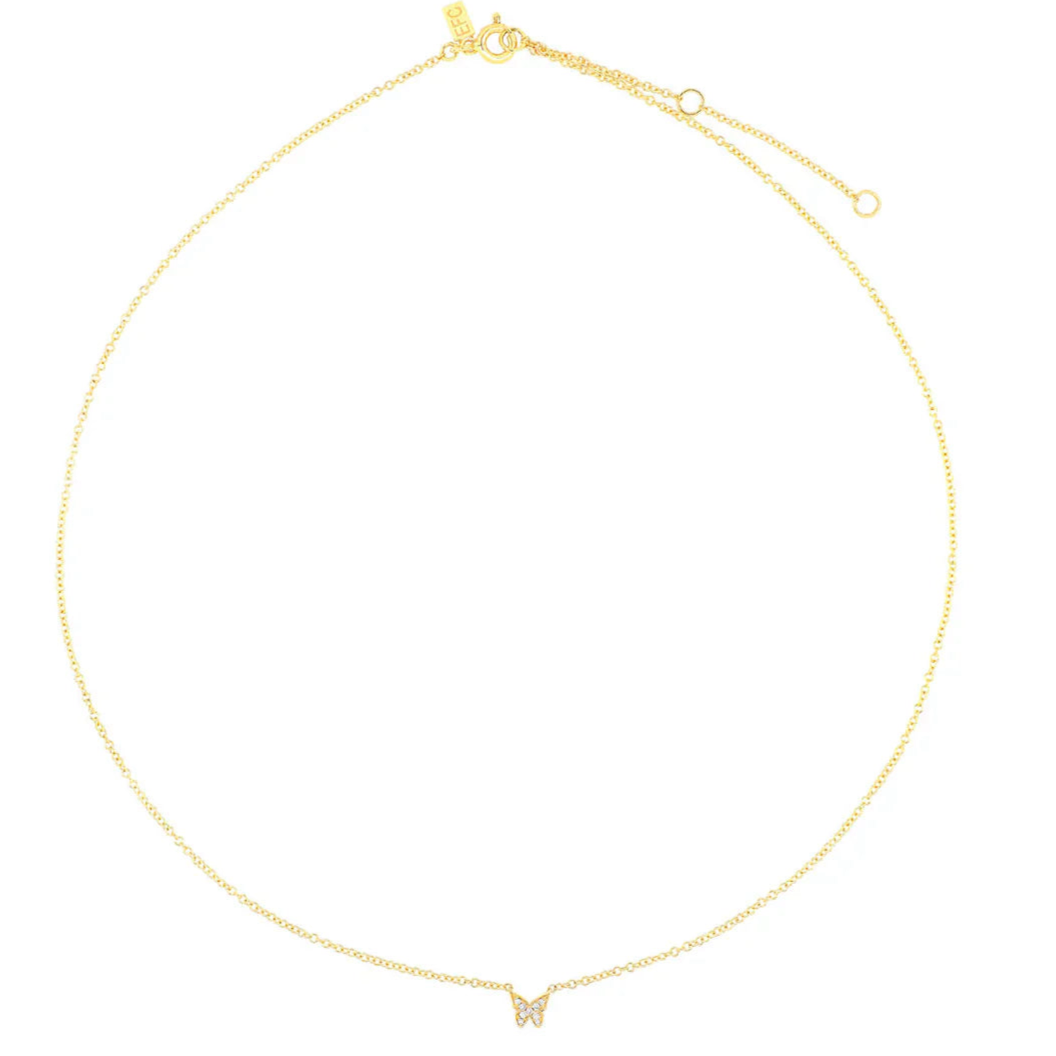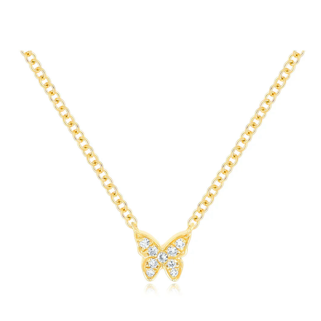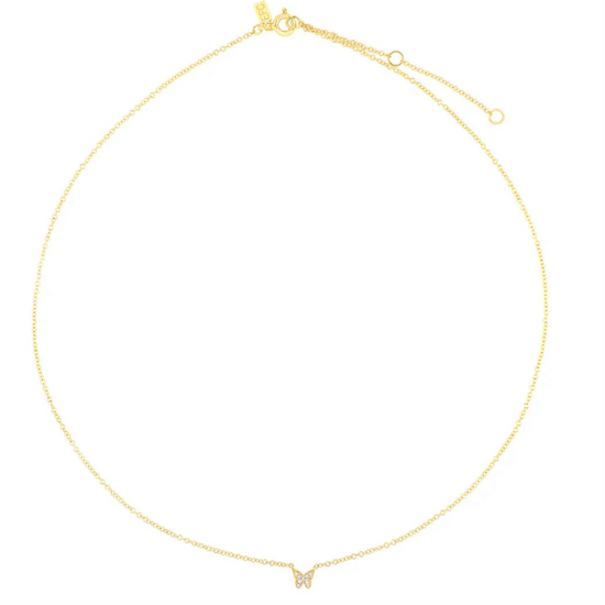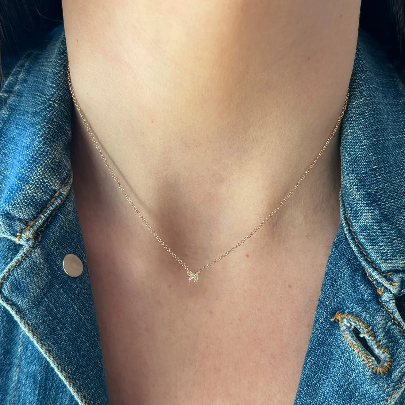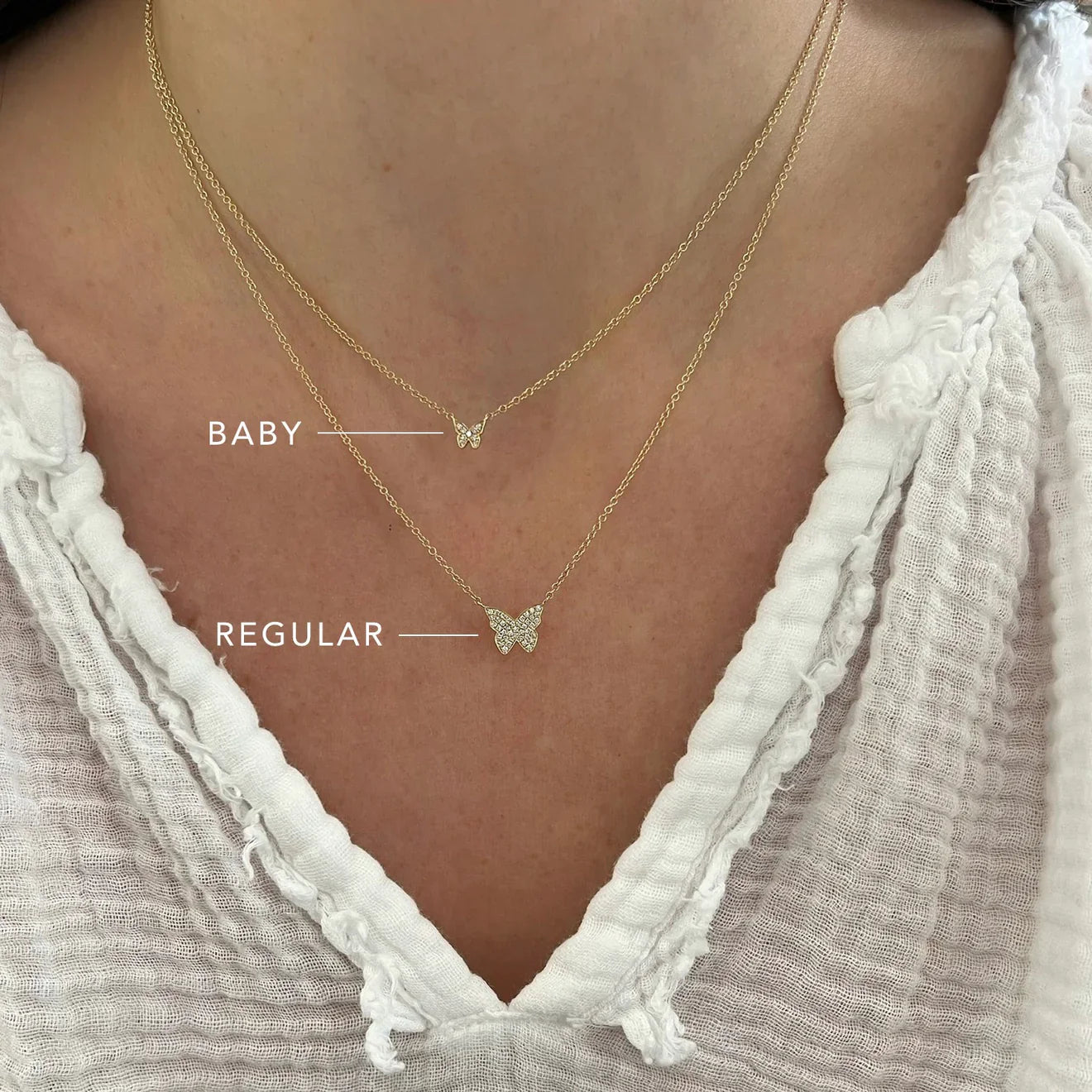 The Diamond Baby Butterfly Necklace soars with small sparkle. This whimsical necklace features .02 carats of pavé diamonds set in a flat miniature butterfly motif suspended from a chain extending from each of the wings.