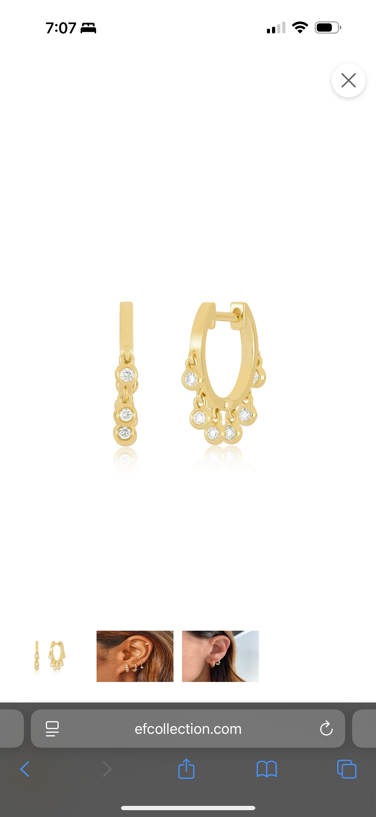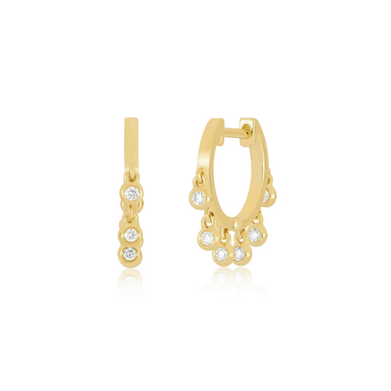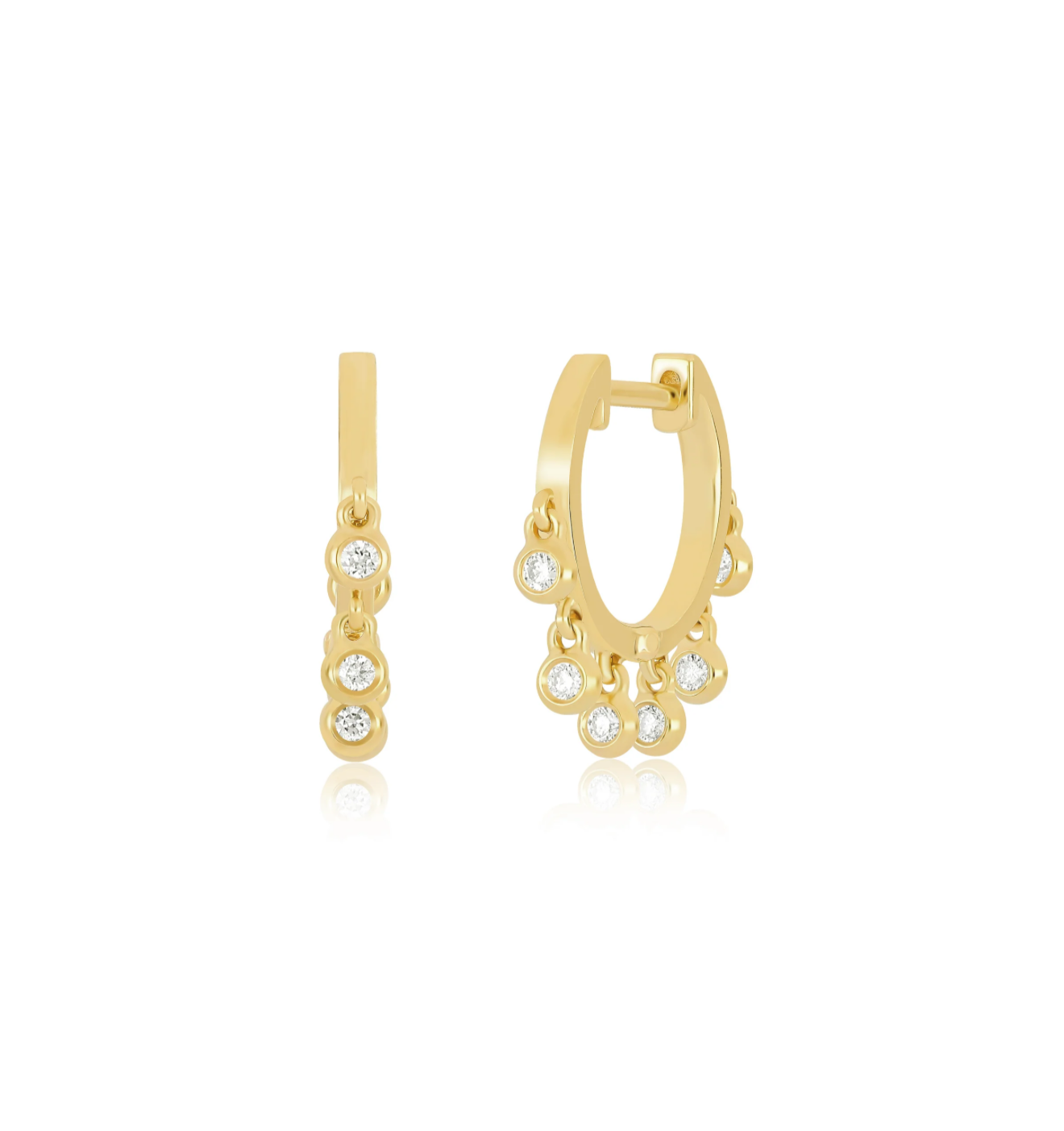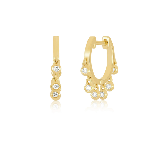 The Diamond Bezel Drop Shimmy Huggie features 6 bezel-set diamonds hanging from a 14k gold huggie. Sold individually or as a classic pair, this festive take on a huggie has been known to make people shimmy, shake, and shine.