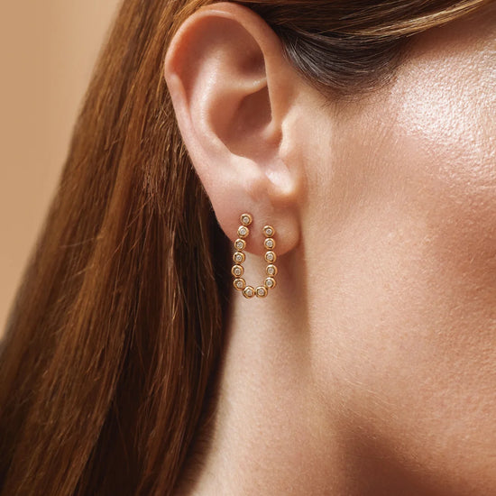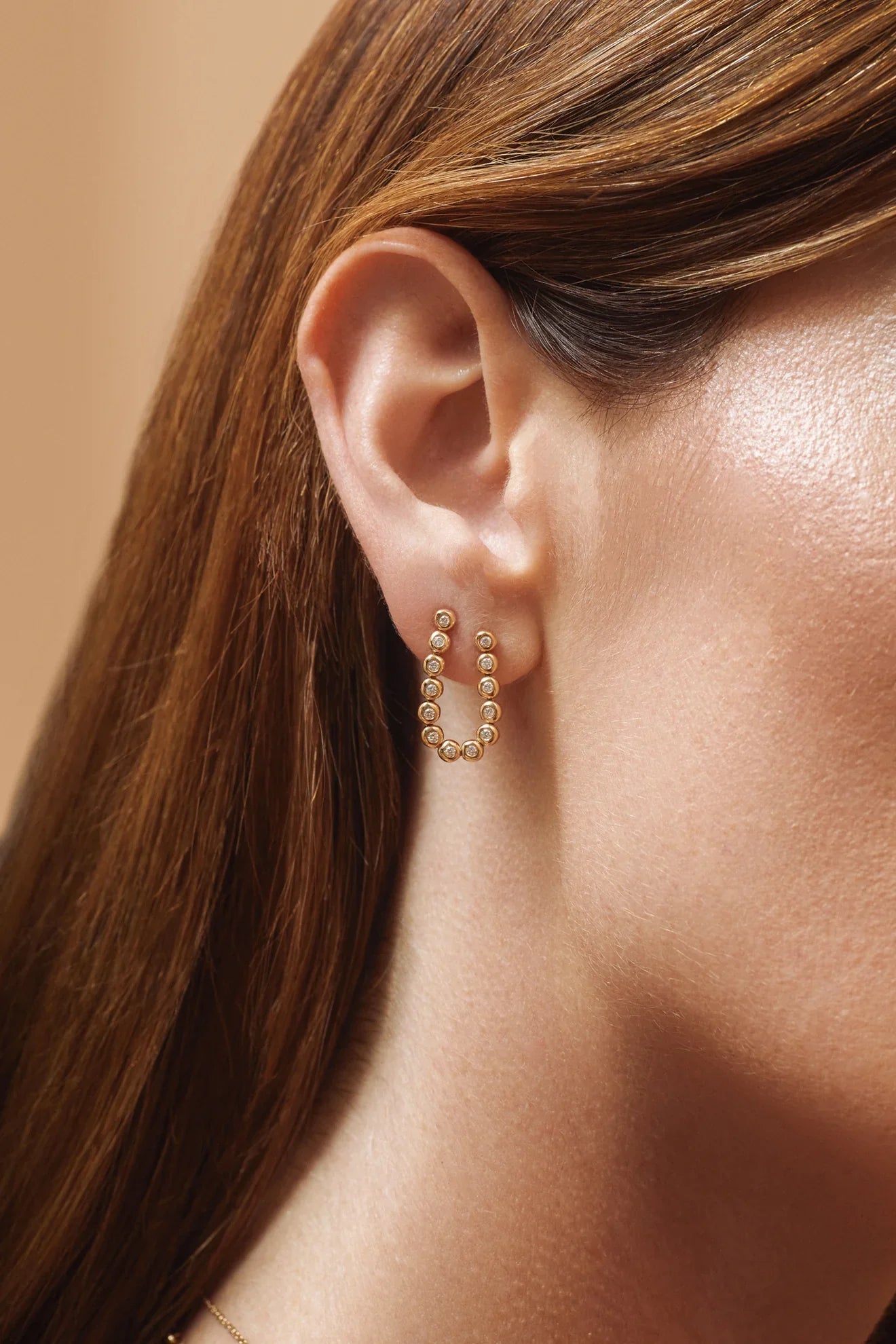 Featuring a chain of diamonds in our signature pillow bezel setting, this double stud connects two piercings with its gold and diamond design. Crafted for consecutive piercings, this standout earring is a modern statement. Sold as a single.