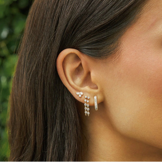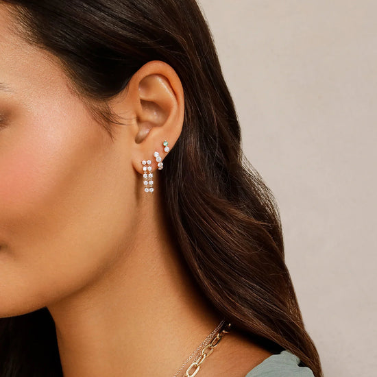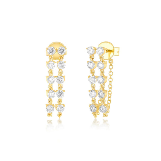 The Double Multi Diamond Chain Stud Earring adds twice the style to one of our best sellers. Featuring two chains with 5 round diamonds each, this earring combines the best of a stud and a hoop into one sparkly essential.