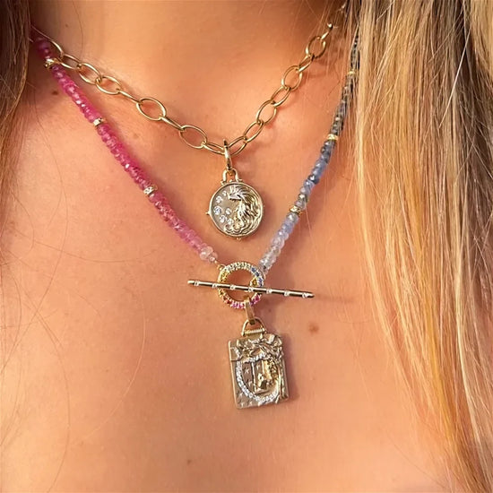 Lost in our dreams sitting under a shady tree... the dreaming tree represents love and hope and wishes to come. Made from 14k yellow gold and sparking pave diamonds, one side of the Dreaming Tree Double Sided Tablet Pendant features a dreaming girl swinging under a shady tree and the other side showcases a pave multi-colored sapphire crescent moon surrounding a bezel set diamond tree of life. From the Stories of Elements Collection, this unique double sided pendant looks stunning hanging from a Three Stories Chain. Pendant and chain sold separate, openable pendant bale included.