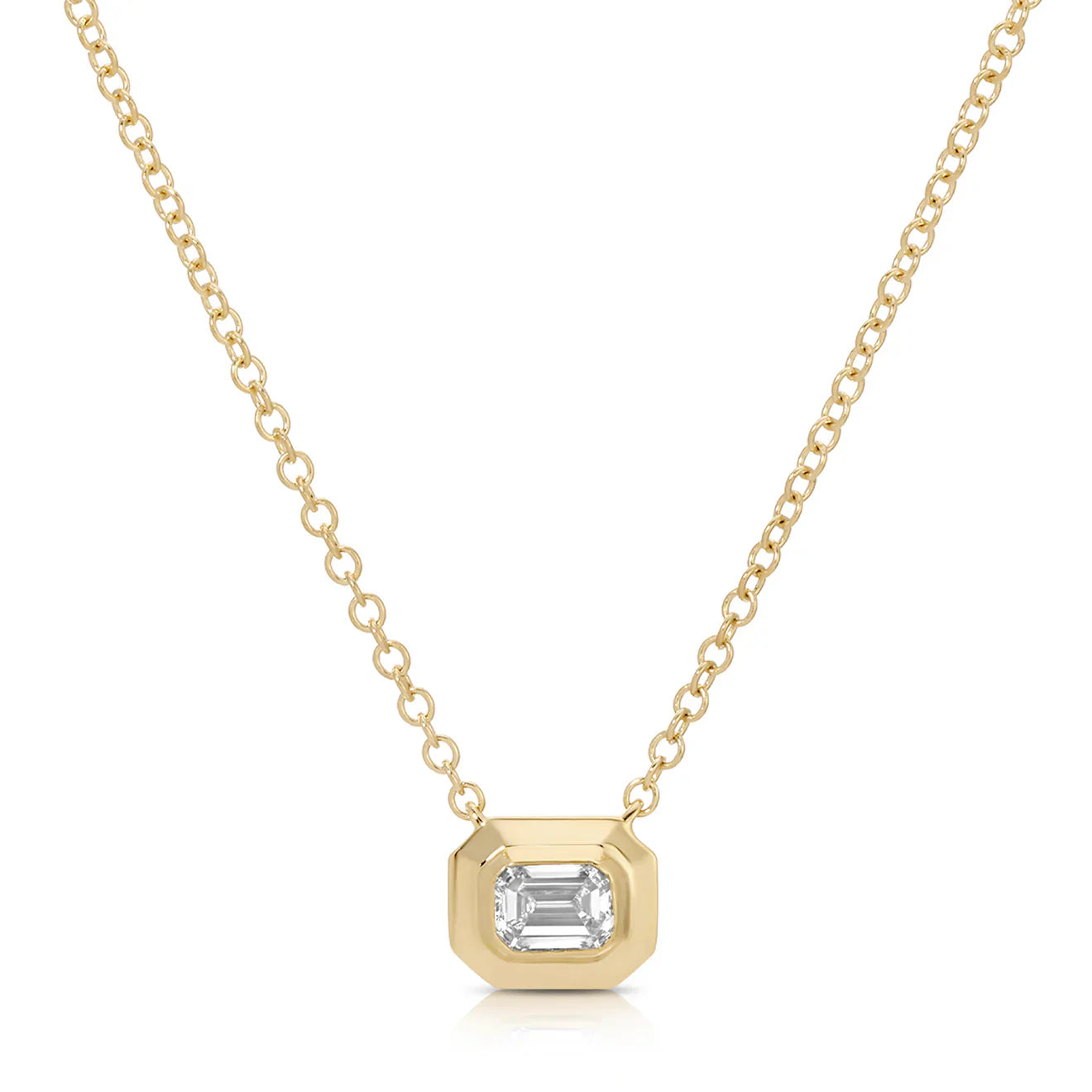 This necklace features an emerald-cut diamond set in a beveled-edge gold bezel, designed to complement the elegant angles of this step-cut stone. Perfect for layering or wearing solo, this piece is a true modern classic.