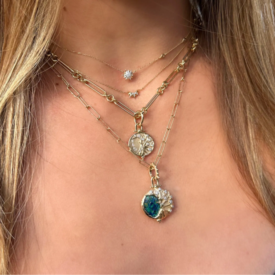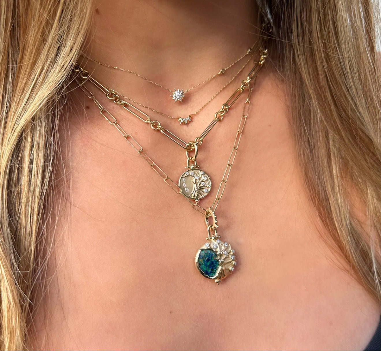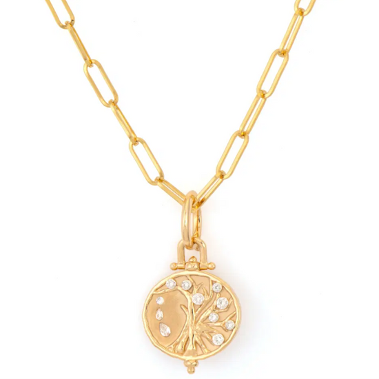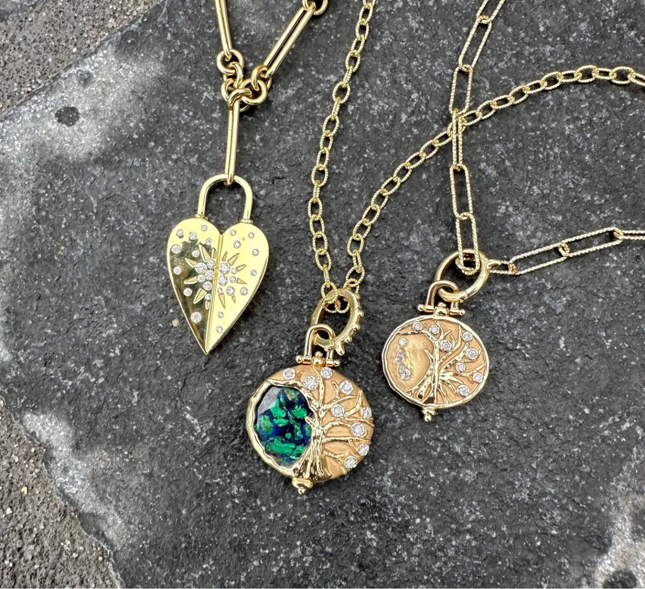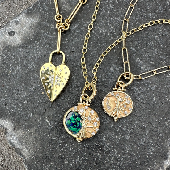 The tree of life represents beauty, hope and strength, each branch reaching up and growing toward the sparkling sky. The Engraved Tree of Life Pendant is a stunning 14k gold and diamond engraved tree of life on the front and the back features an engraved tree with room to personalize your own family tree . From the Stories of Elements Collection, this pendant can be attached to a Three Stories chain necklace or bracelet. Pendant and chain sold separately; openable pendant bale included.