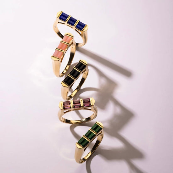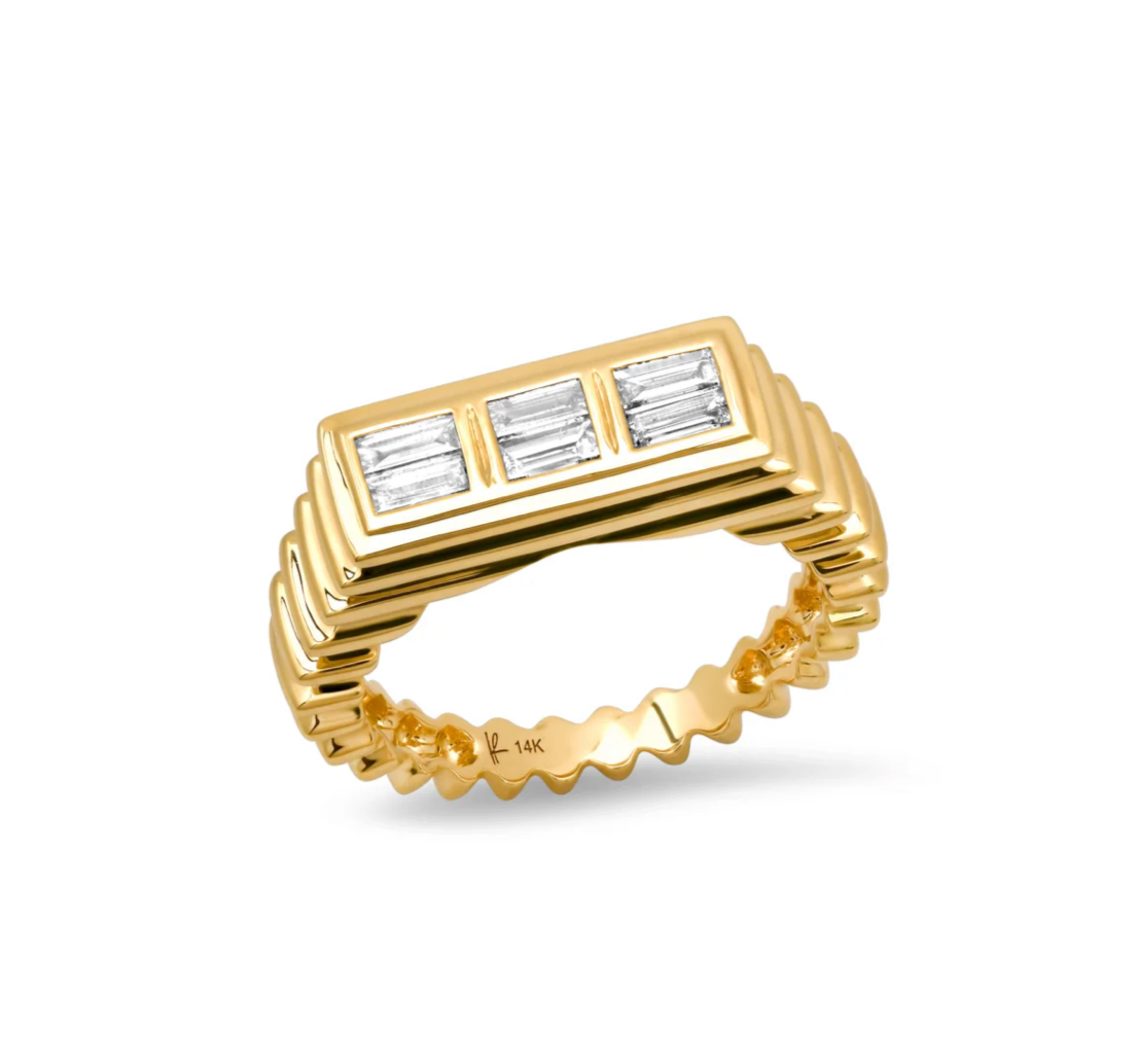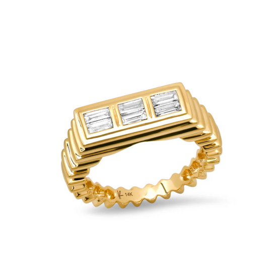 This handcrafted 14K gold fluted colorblock ring features 6 baguette stones. With its unique design, it's a statement piece that commands attention on its own or can serve as a bold addition to your stack.