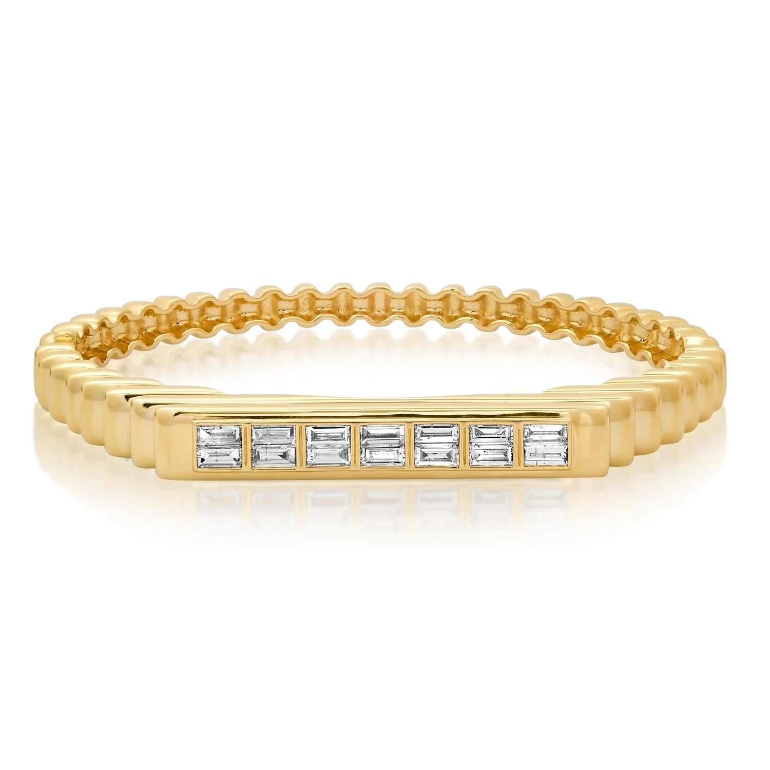 This handcrafted 14K gold fluted colorblock bangle features 14 diamond baguette stones. With its unique design, it's a statement piece that commands attention on its own or can serve as a bold addition to your stack.