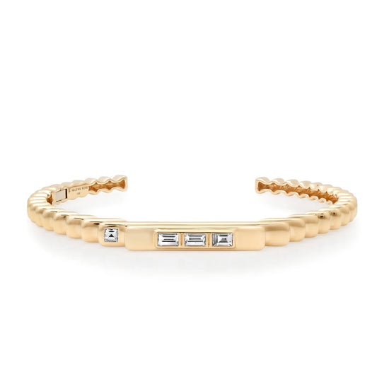 This handcrafted 14K gold fluted color block cuff features 5 diamond baguette stones. With its unique design, it's a statement piece that commands attention on its own or can serve as a bold addition to your stack.