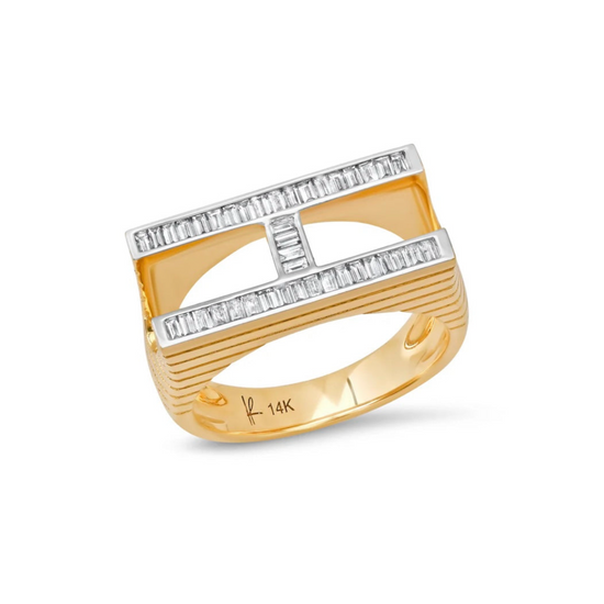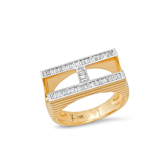 An Extra Large version of our chunky initial ring, the Grandsize chunky initial is double the width of the classic. Encrusted with over 40 diamond baguettes at 0.66 TCW.
