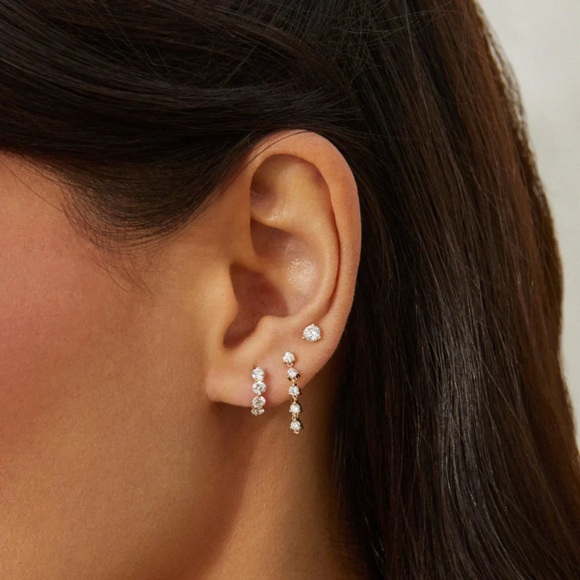 The Jumbo Prong Set Diamond Mini Huggie Earring stands out thanks to the 4 round diamonds per earring, each set with only 3 prongs so you see as much diamond as possible. Available as a single or a classic pair, these huggies can be mixed, matched, and even worn side-by-side as Emily likes to do.