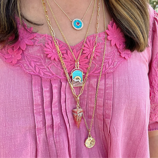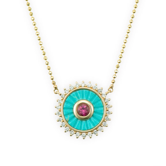 Meditation in Blue and Gold, The Mandala Turquoise Medallion Necklace is a harmonious blend of spiritual symbolism and exquisite craftsmanship. This stunning piece centers around a meticulously designed mandala, a sacred symbol representing the universe in perfect balance. Crafted in 14K yellow gold, the medallion features intricate inlay work with vibrant turquoise, its serene blue hues evoking tranquil skies and calm waters. The mandala pattern is further enhanced with sparkling GSI diamonds, adding a touch of brilliance to the sacred geometry. A single pink tourmaline serves as a focal point, its rosy hue providing a beautiful contrast to the turquoise and gold, symbolizing love and compassion within the balanced universe of the mandala. This spiritual centerpiece hangs from a delicate 1.2mm ball chain, also in 14K yellow gold. The fine chain allows the medallion to take center stage while providing a secure and comfortable wear.