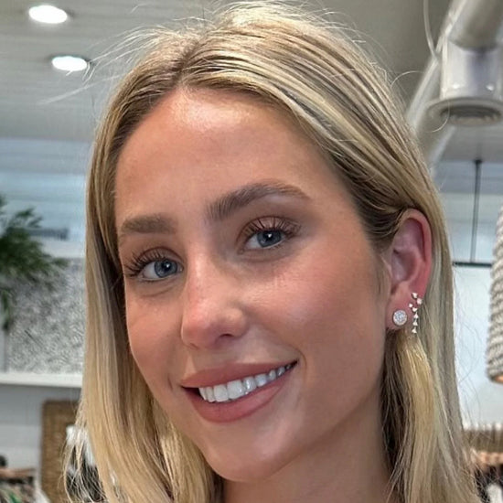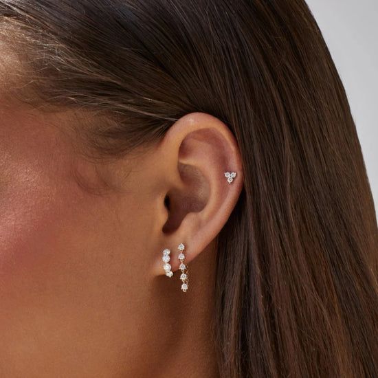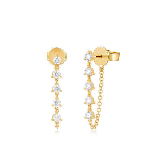 By EF Collection. The Multi Diamond Chain Stud Earring dangles with just the right amount of sparkle. Featuring 5 round diamonds resting along a delicate chain fastening behind the ear, this earring combines the best of a stud and a hoop into one chic style.