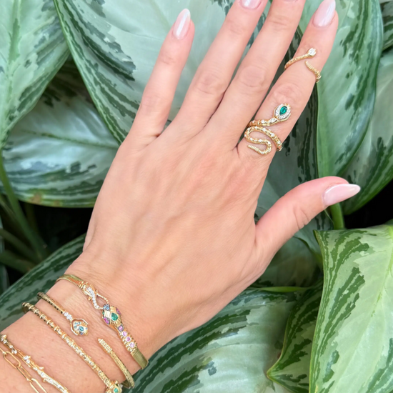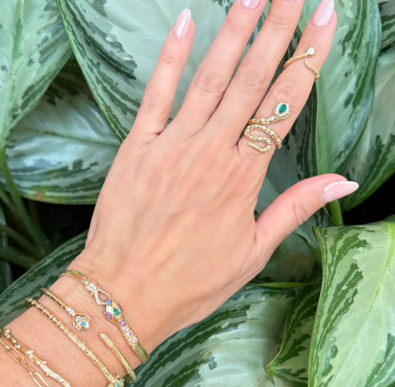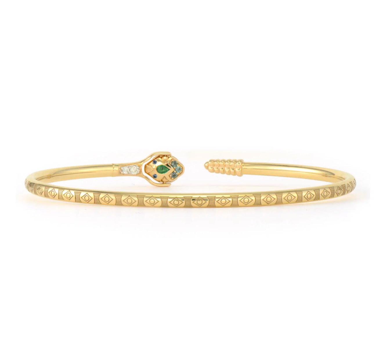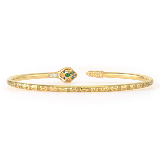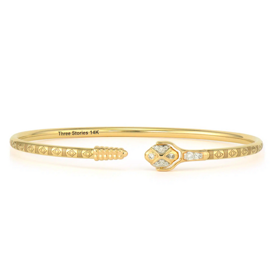 The Rattlesnake Flexible Flip Bangle brings serpentine sophistication to your wrist with innovative design. Crafted in 14K gold, this flexible bangle features an intricate rattlesnake that wraps comfortably around your wrist. The snake's head at one end incorporates a clever flip mechanism, allowing you to choose between two distinct looks.