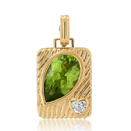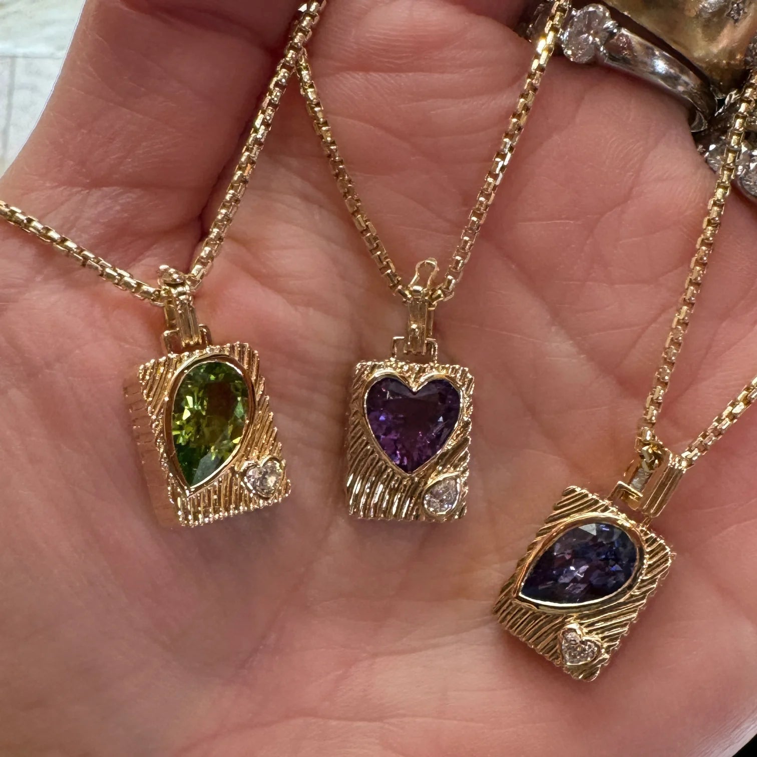 The ripple heart amulet is crafted in 14k gold featuring our rippled texture and set with a vibrant hand cut pear gemstone and heart diamond.