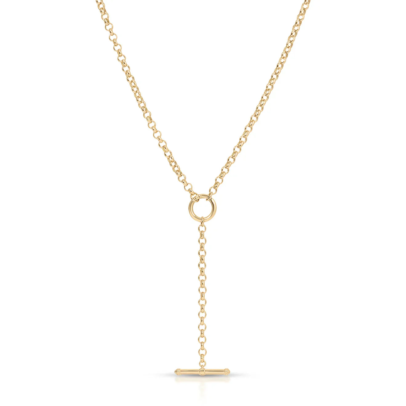Constructed with a modern yet timeless gold chain, the Rolo Chain Enhanced Lariat Necklace serves as the perfect accent. Featuring a 2" lariat drop finished with a gold toggle detail, this necklace is designed to be the centerpiece of your necklace layer- or a standout statement on its own. Complete the look by looping your charms onto the necklace’s seamless, hinged enhancer. Versatility has never looked so chic.