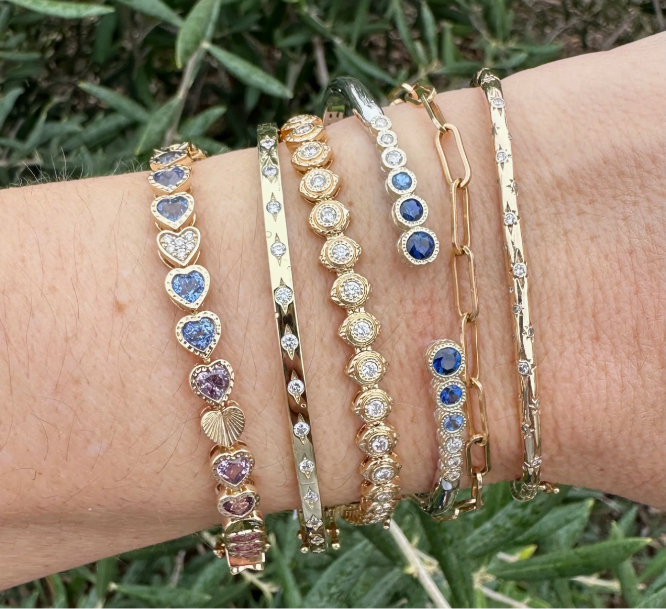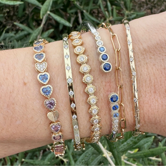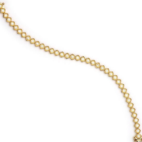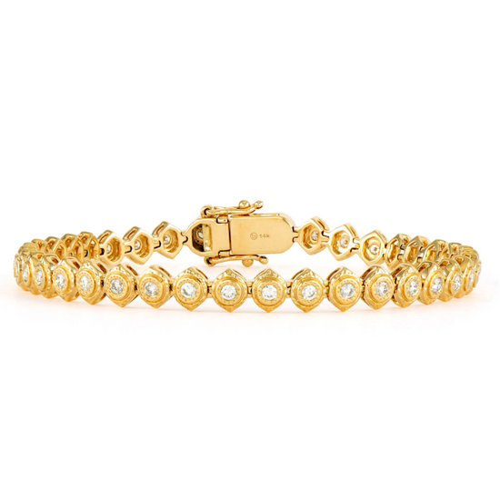 How do you show your love? Diamonds are always a good idea... The Show Your Love Diamond Bezel Tennis Bracelet features round sparkling diamonds set in 14k yellow gold. This link bracelet looks stunning alone or layered in a Three Stories bracelet stack. Box clasp.