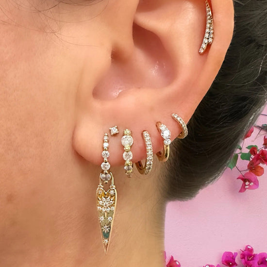 Diamond hoop earrings are always a classic. The Classic Diamond Huggie Hoop earrings are made from 14k yellow gold with sparkling round diamonds in a pave setting. These stunning hoops make a statement on their own or with any Three Stories charm dangling from them. Hoops sold as singles.