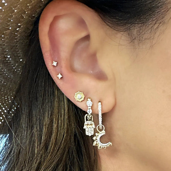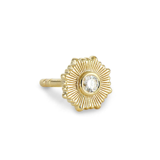 The Single Diamond Flower Stud is made with 14k yellow gold and a sparkling bezel set diamond. This stunning stud looks beautiful worn alone or in a Three Stories earring stack. Studs sold as singles. 14k yellow gold post.