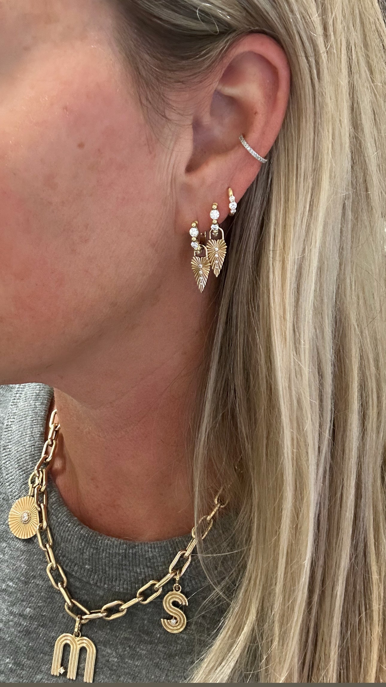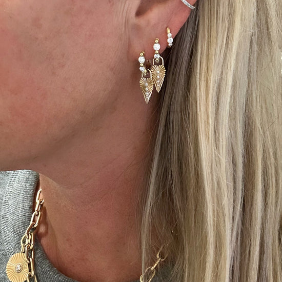 Not your average gold hoop. The Diamond Prong Small Engraved Hoop features 3 prong set round diamonds in 14k yellow gold with engraving etching details in the gold. These stunning hoops make a statement on their own or with any Three Stories charm dangling from them. Hoops sold as singles.
