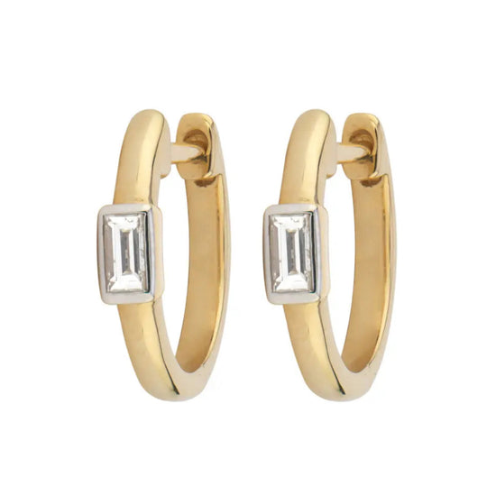 Make it a classic! The Small Baguette Huggie Hoop earring is an updated look on the classic huggie. Featuring a stunning baguette diamond set in 14k yellow gold, these gold huggie earrings look amazing alone or with a Three Stories charm dangling from them. Hoops sold as singles.