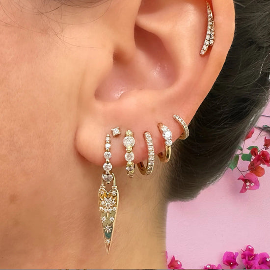 Small but mighty! These Small Oval Graduated Diamond Huggie Hoop Earrings feature prong set small to large graduated round diamonds in 14k yellow gold. These stunners look amazing alone or with a Three Stories charm dangling from them. Hoops and charms sold separately. Hoops sold as singles.