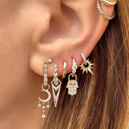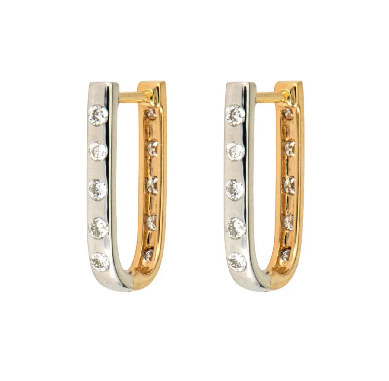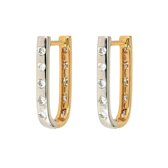 Do you prefer white gold or yellow gold? With the White and Yellow Double Sided Curved Diamond Hoop earrings you don't have to choose! These curved hoop earrings feature 5 metal set diamonds in 14k yellow gold on one side and 5 metal set diamonds in 14k white gold on the other. These are the perfect hoops for the person who likes to switch up their metal game! Hoops and charms sold separately. Hoops sold as singles.