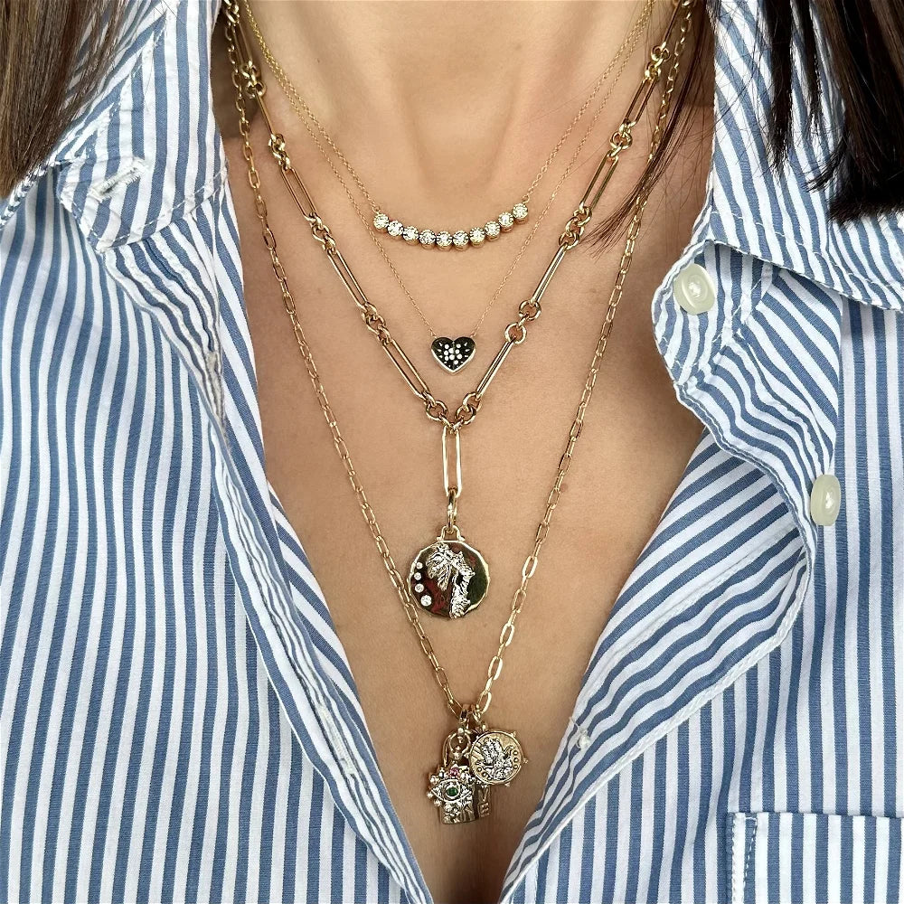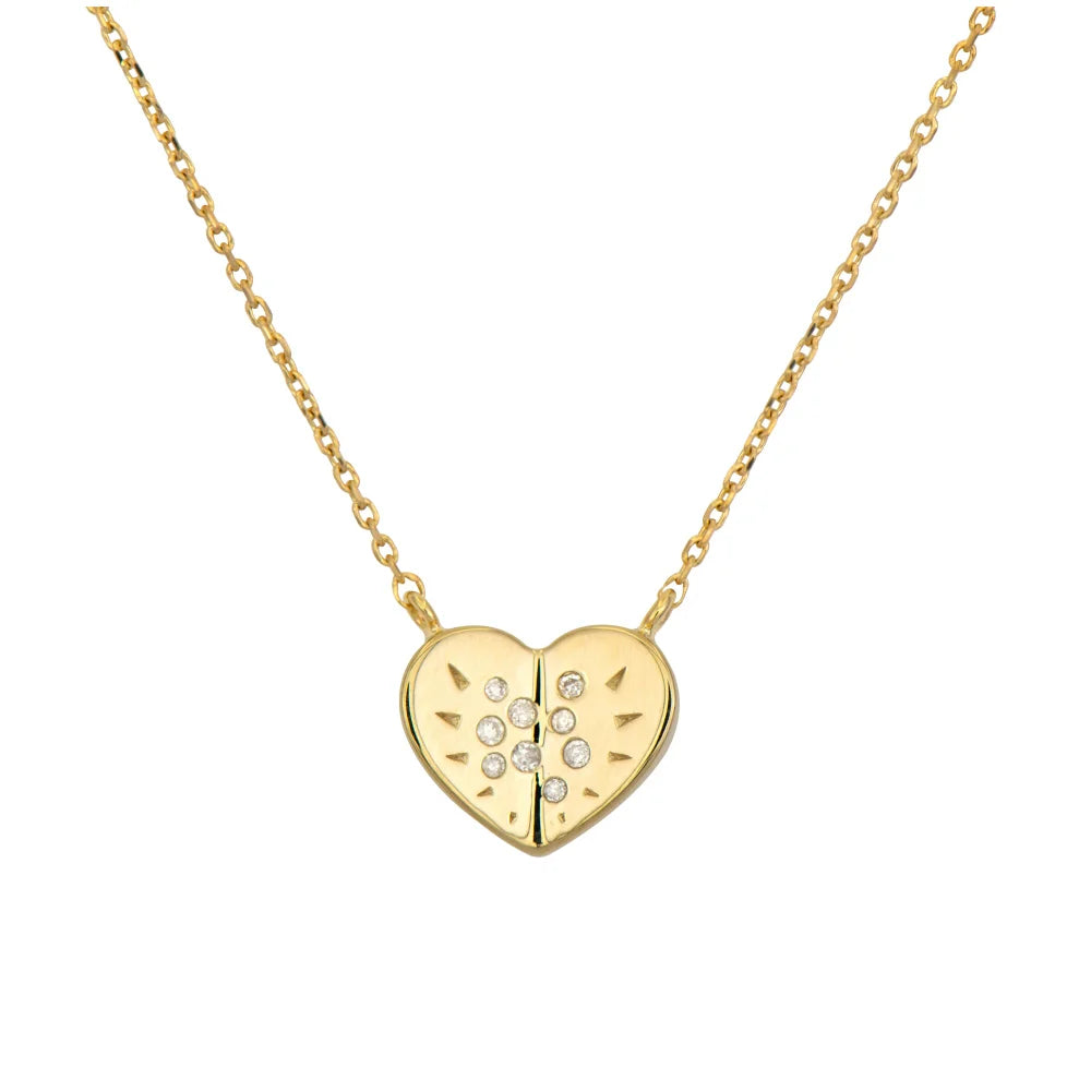 It's a love explosion! The Small Love Explosion Heart Necklace brings the signature love explosion to a smaller scale. This 14k yellow gold pendant is accented by round diamonds on a 14k yellow gold rolo chain. 18 inches with a jump ring at 16" and 17".