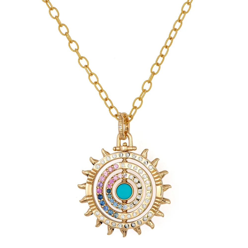 How do you tell your story? With the Tell Your Story Large Zodiac Flip Pendant, there are so many ways. This stunning pendant rotates and turns to showcase the zodiac symbols, moon signs and more. Made of 14k Yellow gold with diamonds, multi-colored sapphire and turquoise, this stunning pendant is sure to tell your story. Pendant comes with openable pendant bale, chain sold separately