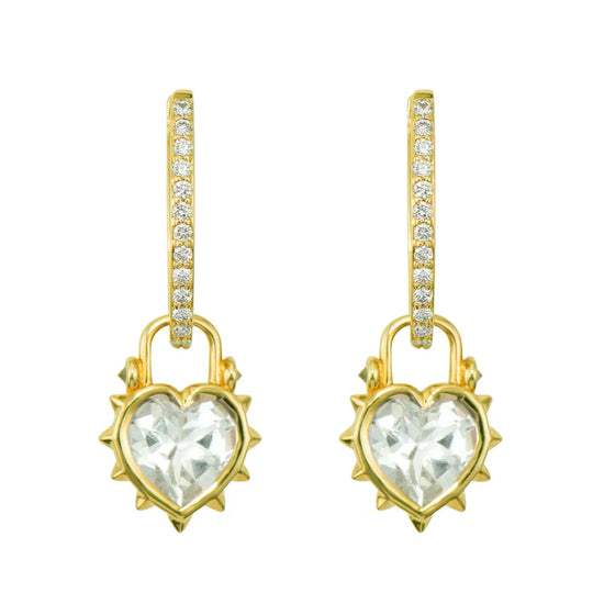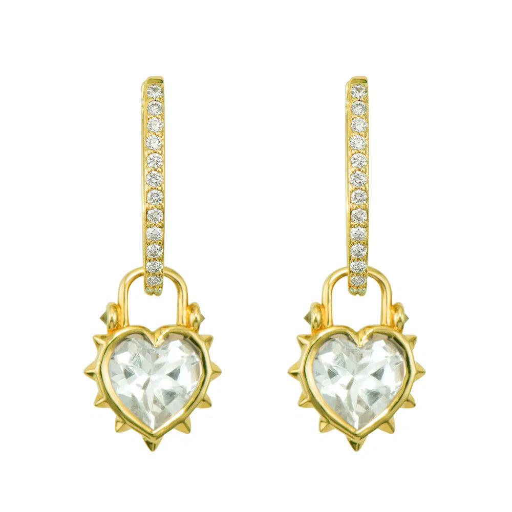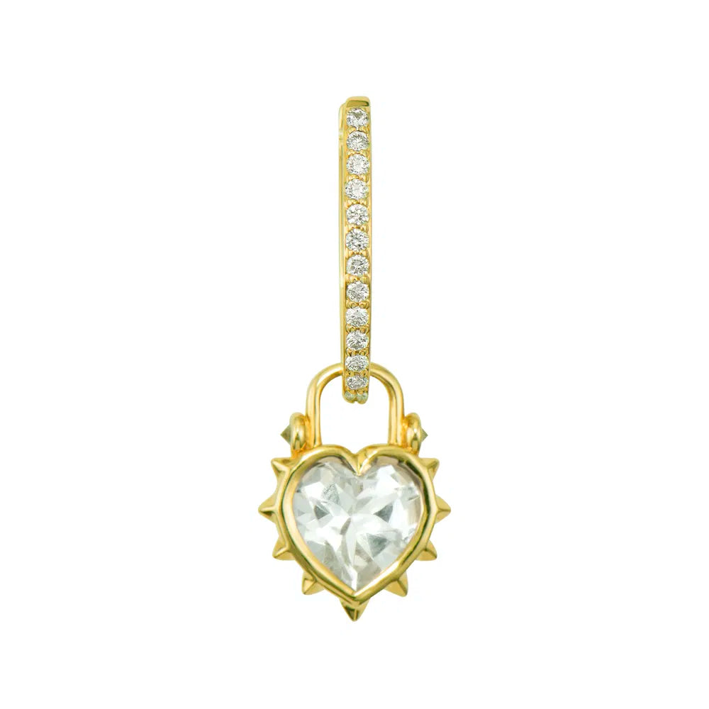 This Thorned Jewel Heart Charm features a striking contrast between delicate and edgy elements. Crafted in 14K yellow gold, the centerpiece is a heart-shaped white topaz, beautifully secured in a bezel setting. Surrounding this clear gem are thorny spikes that give this charm its distinctive character, with a few diamonds adding unexpected sparkle among the thorns. The juxtaposition of the smooth, elegant topaz against the protective thorns creates a meaningful statement piece. This sparkling gold charm can be worn on Three Stories hoop earrings or added to a chain bracelet or necklace by adding an openable pendant bale. Hoops and charms sold separately.