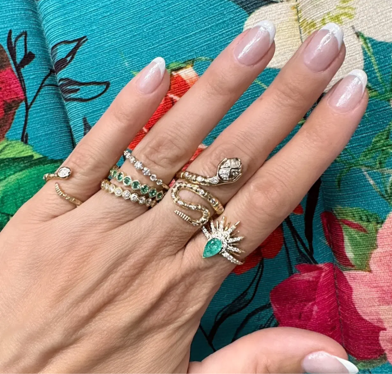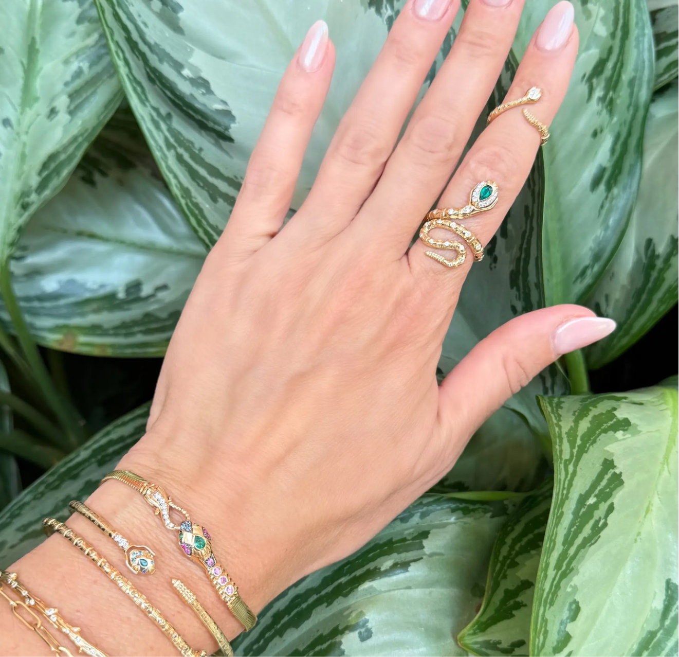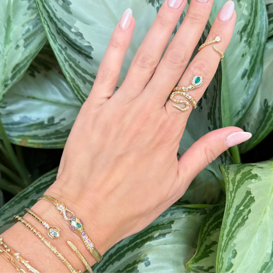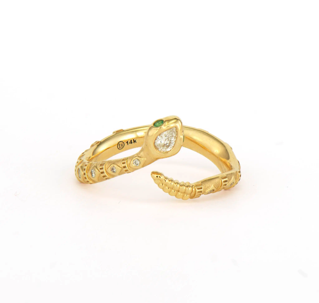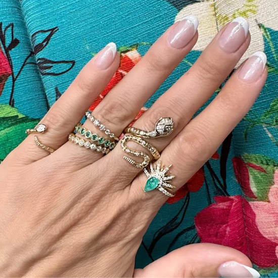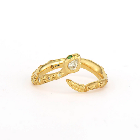 This Tiny Rattlesnake Band brings serpentine charm to your smallest finger. Crafted in 14K yellow gold, this delicate pinky ring features an intricately detailed rattlesnake that wraps gracefully around your finger. The snake's head is adorned with a pear-shaped diamond, while emerald eyes add a vibrant pop of color to complete the design. Despite its tiny scale, every detail is meticulously crafted to capture the essence of this powerful creature. This unique pinky ring adds a touch of mystique and symbolism to your jewelry collection, perfect for those who appreciate meaningful, conversation-starting pieces.