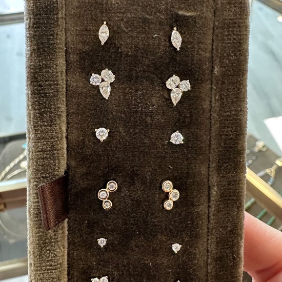 The Triple Treasure Stud Earring features a cluster of sparkling gems. Get colorful with this cool-toned baguette emerald, round diamond, and marquise turquoise stud.