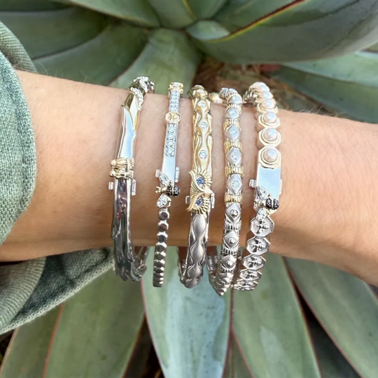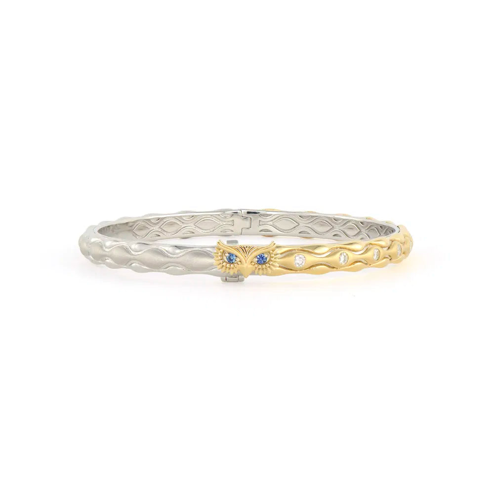 The two-toned metals create stunning contrast while the organic feather pattern flows gracefully around your wrist. The distinctive clasp features an owl eye adorned with blue sapphires, bringing both functionality and symbolic meaning to this piece. This meaningful bangle celebrates wisdom and intuition, perfect for those who appreciate jewelry with deeper significance. Wear alone or in a Three Stories bangle stack.