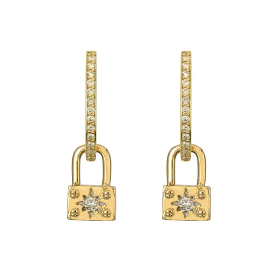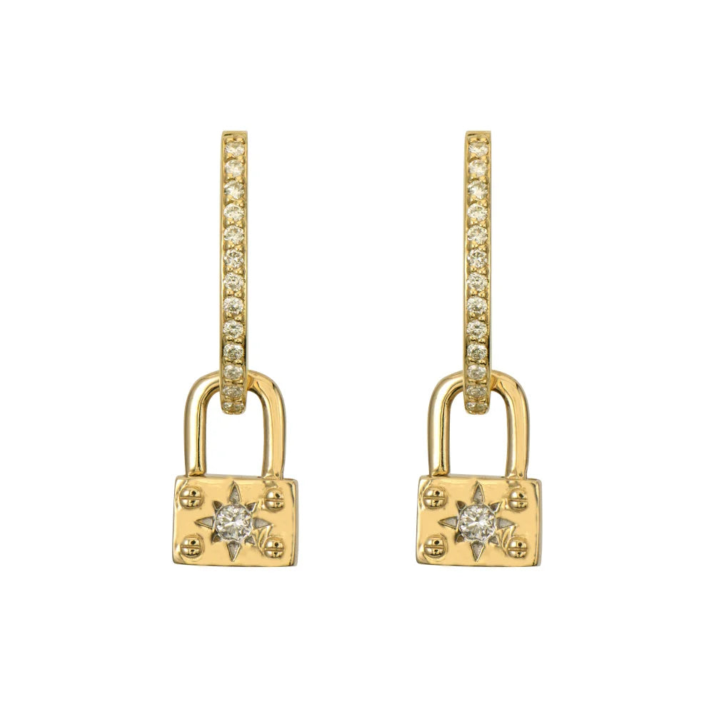 Unlock your heart with the Unlock Love Starburst Charms. This sweet charm features the signature Stories of Love starburst on 14k yellow gold with sparkling white diamonds. Worn on Three Stories hoop earrings or added to a chain necklace or bracelet, this little lock is sure to show the love. Hoops and charms sold separately, charms sold as singles.