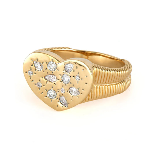 It's a Love Explosion! The Wide Love Explosion Ring will have you feeling the love! Featuring metal set round and pear shaped diamonds in 14k yellow gold this stunning ring also features a tapered band with engraving. Wear alone or paired with your Three Stories ring stack. Size 6.5.